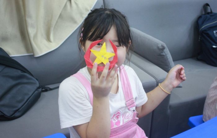 支教课堂上,孩子展示“红星耀国安·信仰折纸情”活动中制作的红星折纸 谢波华摄。
