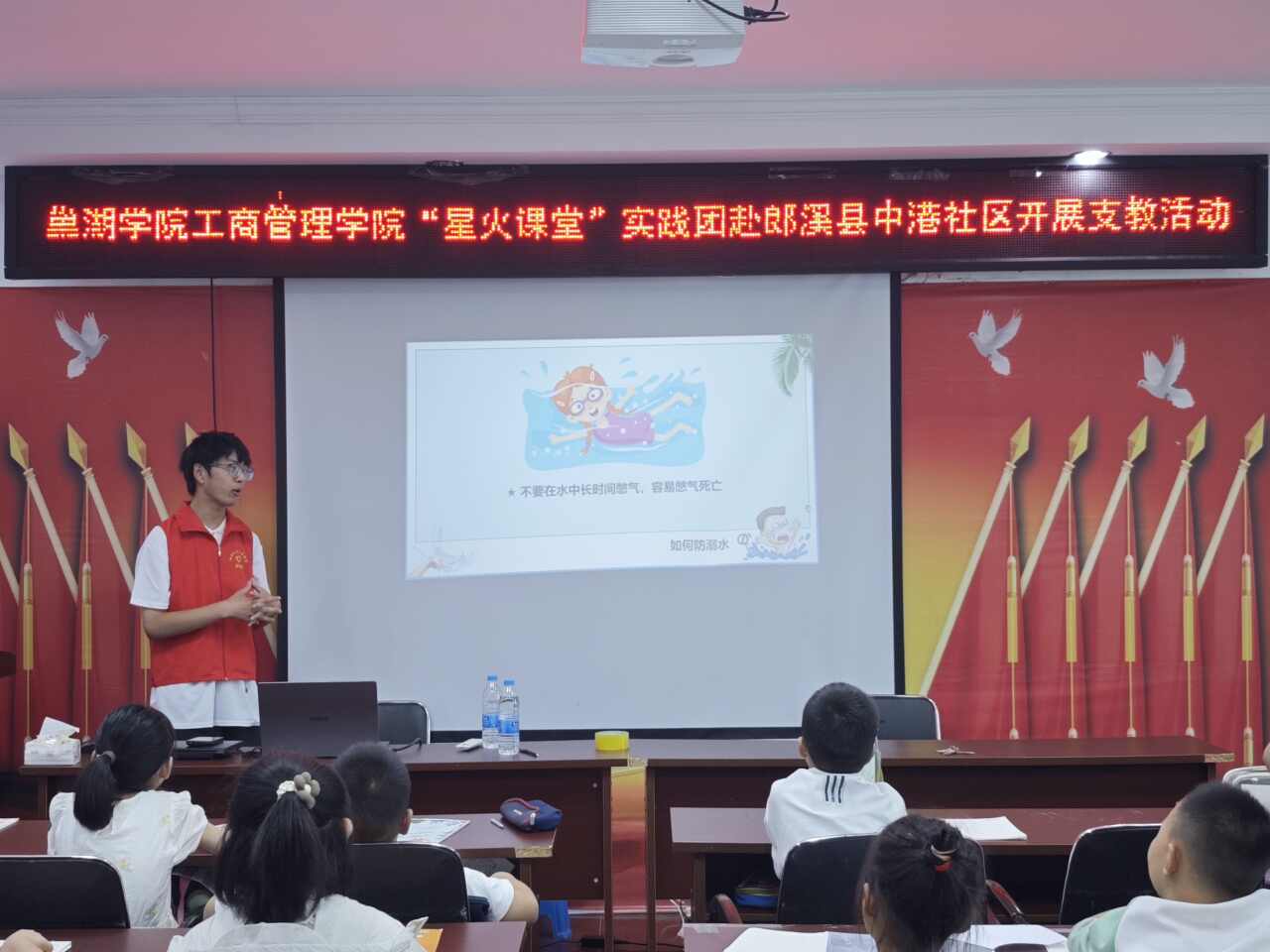 守护生命之舟,远离溺水之患。暑期天气炎热,汛情频发,青少年溺水事故频繁发生在全国各地。为有效防止青少年溺水事故发生,增强青少年安全防范意识和自我保护能力,巢湖学院工商管理学院星火课堂实践团于6月30日上午赴郎溪县中港社区新时代文明实践站开展防溺水主题宣讲。