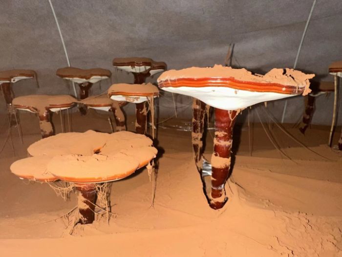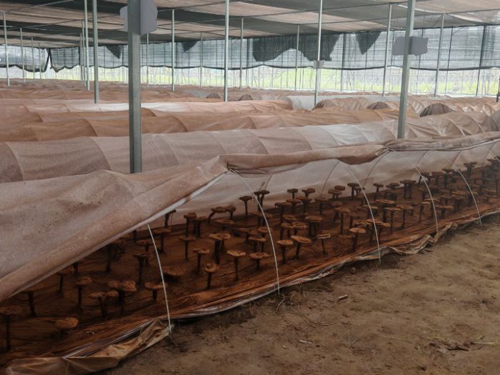 更令人震撼的画卷在下符桥镇灵芝种植基地展开。时值八月,正值灵芝喷粉的黄金季节。放眼望去,数百座标准化灵芝大棚整齐排列,绵延不绝,蔚为壮观,构成了一片孕育生命奇迹的独特“森林”。团队成员深入大棚,近距离观察并详细记录了灵芝孢子粉的采集过程:工人们小心翼翼地覆盖特制收集膜,待饱含精华的孢子粉自然弹射附着后,再进行专业的收集、筛选与储存。