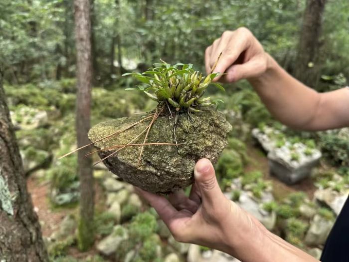 在九仙尊米斛养生谷,团队成员被眼前的“生态实验室”震撼——总面积超1万亩的山谷中,数千块天然岩石错落分布,每块岩石缝隙间都生长着形态各异的霍山米斛。“这里完全模拟了《名医别录》中‘石斛生六安山谷水傍石上’的原生环境。”九仙尊技术负责人戴亚峰介绍,公司斥资5亿元打造的养生谷,通过“无土架空、遮阳补湿”技术,将石斛成活率提升至95%以上,品质与野生石斛相似度达99%。