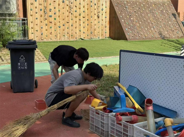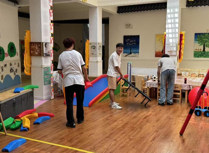 清洁组专攻卫生死角,实践团成员们用儿童专用消毒水擦拭玩具架、滑梯扶手等孩子常接触的地方,细致清理操场缝隙里的小石子,还对卫生间进行深度清洁,连图书角散落的绘本也一一修补分类上架。实践团成员的细致与认真让园方称赞连连。