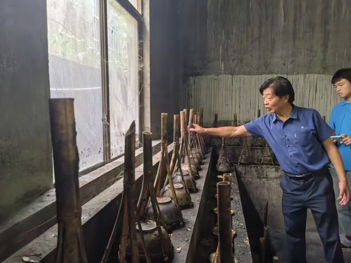 炼烟是徽墨制作的起始环节,窑炉以松木或桐油作为燃料。项德胜介绍,火候控制需依赖操作人员的经验,火势过大会导致烟粉含杂质,过小则使烟质松散,需通过调整风门、观察烟色实时调控。