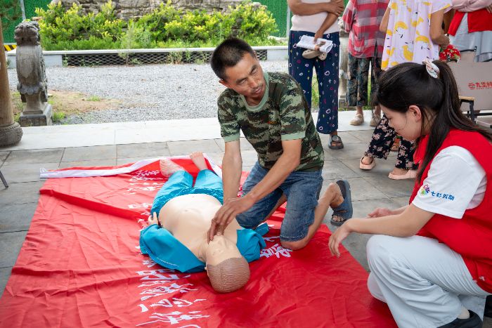 其次,在知识科普方面,实践团成员秉持着“知识传递,播撒急救火种”的宗旨,以心肺复苏的正确操作为核心内容,面向现场的小朋友和居民展示心肺复苏急救操作。同时实践团成员还邀请小朋友运用假人模型进行急救实践操作,并手把手耐心纠正各种细节问题。面对紧张的小朋友,实践团成员以亲切温和的态度和鼓励性的话语,帮助他们克服障碍,成功完成心肺复苏模拟操作。并鼓励小朋友们要积极参与实践,通过亲身体验,深刻掌握心肺复苏等重要急救技能,为社会播撒下更多急救知识的火种,也为小朋友们的安全增添了一份保障。