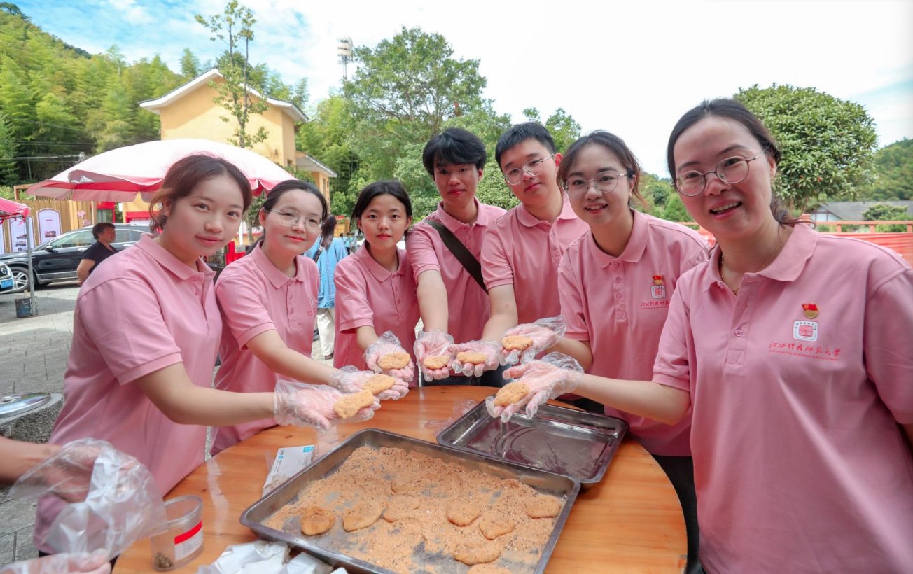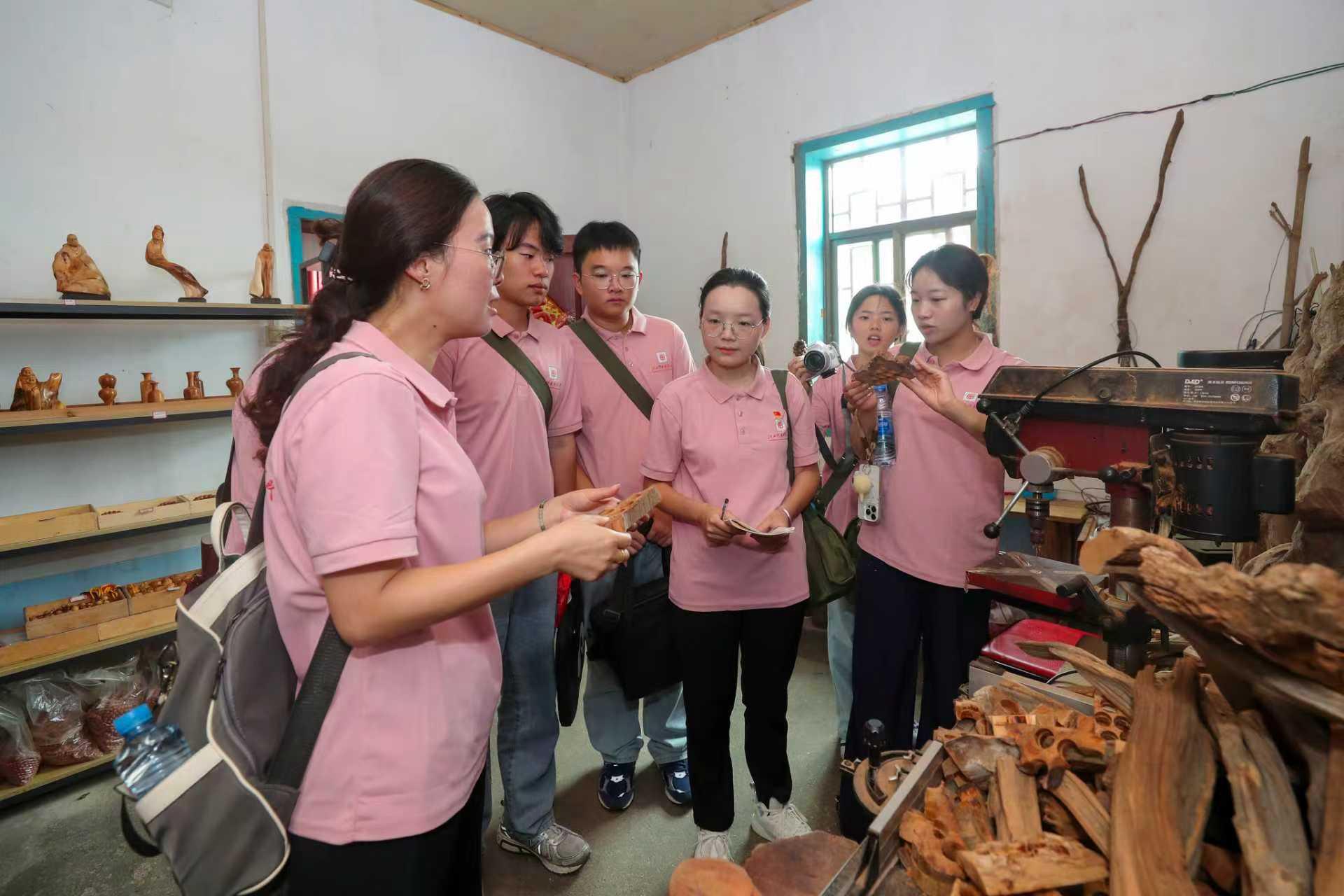 “嘿呦,嘿呦!”在阵阵号子声中团队抵达红军烈士后代左秀发家的小院——当年总书记亲手打过糍粑的地方。队员们抡起木槌体验打糍粑。热气腾腾的糯米香气四溢,正如村民红火的日子,“糍粑越打越黏,日子越过越甜”。屋内竹屑轻飞,胡艳霞正在使用机器雕刻精美的竹筒作品,每一刀都是文化与生计的融合,是“绿水青山就是金山银山”的生动实践。队员们品尝着自己亲手制作的糍粑,欣赏着精美竹雕作品,深切感受到乡村振兴中文化传承与产业发展的相得益彰。