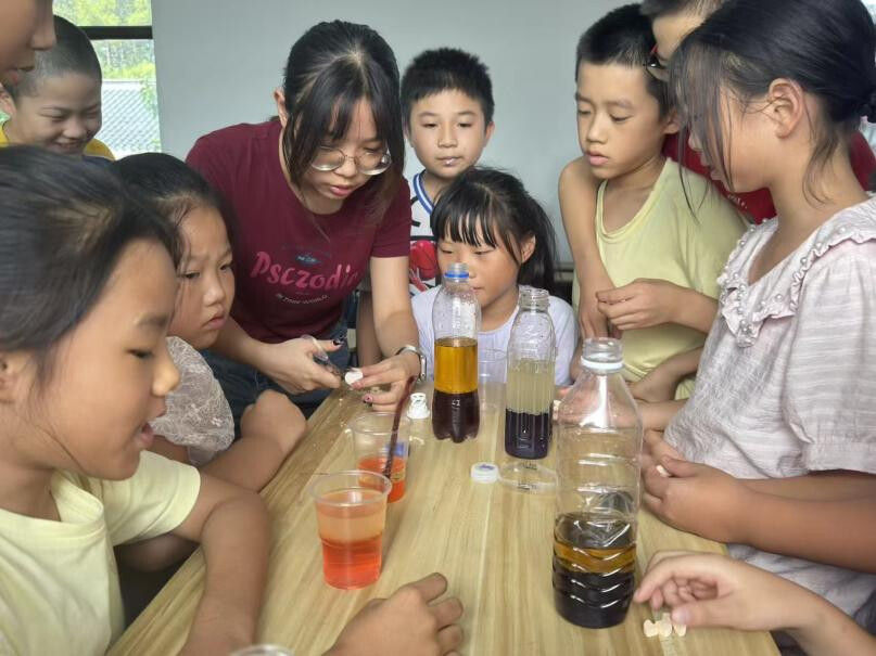 在基础课程方面,支教团队注重启发兴趣与夯实基础。语文课上,支教老师用故事解读文字背后的情感;数学课上,他们跳出枯燥公式,用生活中的案例讲解加减乘除、几何图形,让抽象知识变得 “看得见、用得上”;英语课上,通过趣味单词游戏、简单对话模拟,孩子们从 “不敢开口” 到主动举手,感受语言的魅力。其它课程方面,支教团队致力于激发孩子们多方面兴趣,开展了音乐、科学、体育、美术、卫生健康等课程。音乐教室内,孩子们在支教老师的指导下合唱动画主题曲,清脆的歌声展现出蓬勃朝气;科学课堂上,“熔岩灯”制作、酸碱性变色等化学小实验,以互动方式激发学生对科学原理的探索兴趣;体育活动中融入“跳格子”等传统游戏,既锻炼体能又增强团队协作;美术课上,学生利用扭扭棒等材料创作手工作品,在实践中提升审美与创造力。