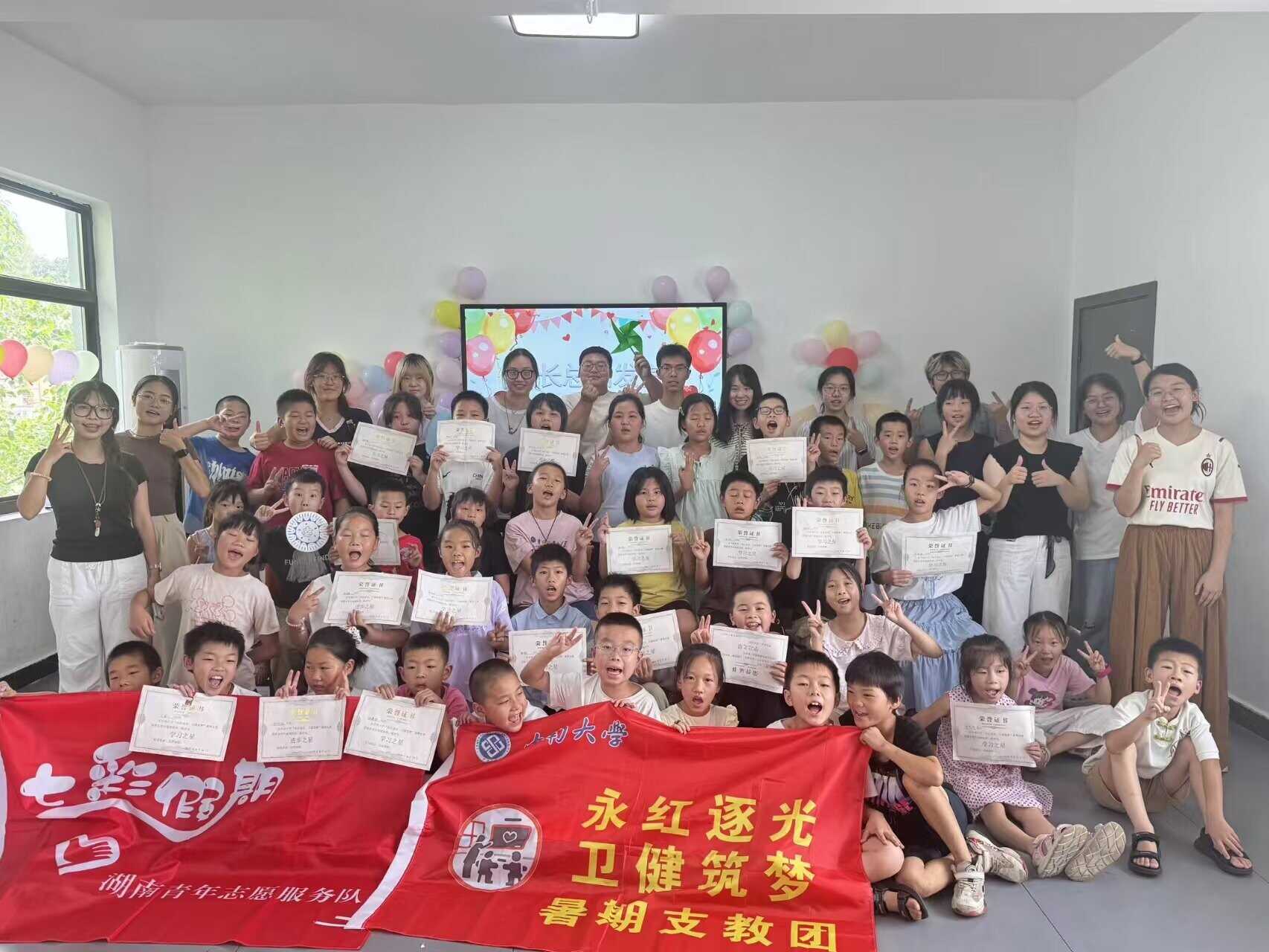 2025年8月4日至22日,中南大学“永红逐光,卫健筑梦”暑期支教团在湖南省岳阳市汨罗市桃林寺镇永红小学开展了为期三周的关爱农村留守儿童“七彩假期”志愿服务活动。本次支教以学业辅导与健康科普为核心,为乡村儿童打造了多元丰富的暑期学习体验。