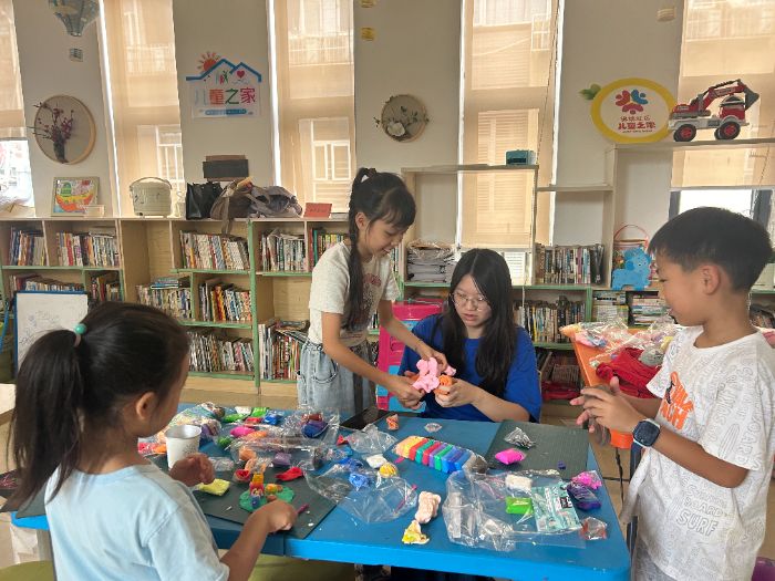 8月25日,实践队第四次走进锦绣社区,为10余名儿童带来“指尖生花”主题审美教育实践。活动中,志愿者手把手指导孩子们用五彩扭扭棒编织向日葵、郁金香花束,从色彩搭配到造型塑造,耐心讲解每一个步骤,引导儿童感知不同色彩传递的情绪;随后发放环保粘土,以“最喜欢的世界”为主题鼓励自由创作,孩子们充分发挥想象,将粘土捏成恐龙、蛋糕、梦想城堡等童趣作品。教室里欢声不断,孩子们的创意成果赢得家长纷纷点赞。