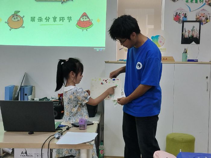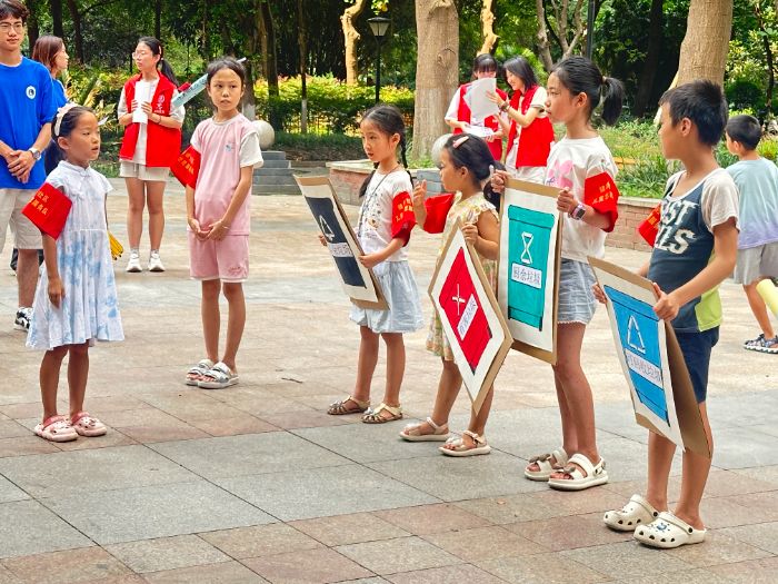 作为此次实践的收官日,团队以“实践反馈”为主题,引导孩子们用行动回馈社区。上午,实践队带领小朋友排练《垃圾分类王国奇遇记》情景剧:先指导大家发挥想象制作角色道具,再通过扮演垃圾桶精灵、垃圾宝宝、小导游等角色,学习生活常见物品的分类方法。下午,在社区老师带领下,实践队员与小朋友走进居民楼开展垃圾分类宣传——孩子们先表演情景剧,再发放传单、组织“垃圾卡片投放”互动,引导居民将垃圾卡片投给对应“垃圾桶精灵”,帮助居民强化垃圾分类意识。
