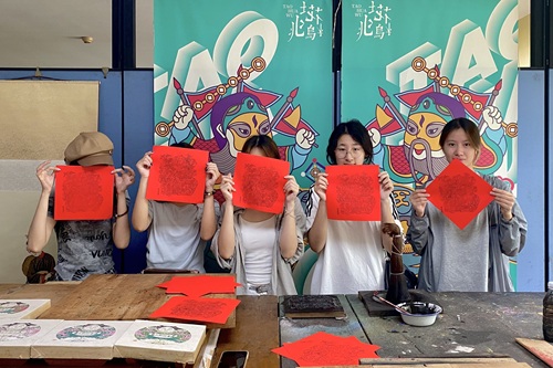 在桃花坞年画社中,团队成员们认真聆听传承人的讲解,木版的选材、雕刻,到颜料的调配、拓印,每一道工序都凝结着匠人的巧思与坚守;观赏陈列的年画作品,无论是描绘生产生活的《荡湖船》,还是寓意吉祥的《河蚌戏珠》,热情洋溢的色彩与生动鲜活的形象都让人赞叹不已。在互动体验环节,成员们在传承人的指导下尝试了拓印操作,获得了自己印得的年画作品。