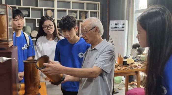 问道传承名家 探路创新发展 当实践触及"传承如何可持续"的深层思考时,非遗传承人的经验为团队提供了答案。拜访国家级竹簧传承人何华一先生,其"非遗要活在当下"的理念与实践极具启示:他将竹簧从传统摆件拓展至现代壁画、家居装饰,用设计创新让古老技艺融入生活;其女探索的"非遗 + 文创"、"非遗 + 研学"路径,则展现了传统与市场结合的可能。何家父女的实践印证了传承需以创新为桥,让文化在时代语境中找到新坐标,为团队的传承思考打开了新视野。