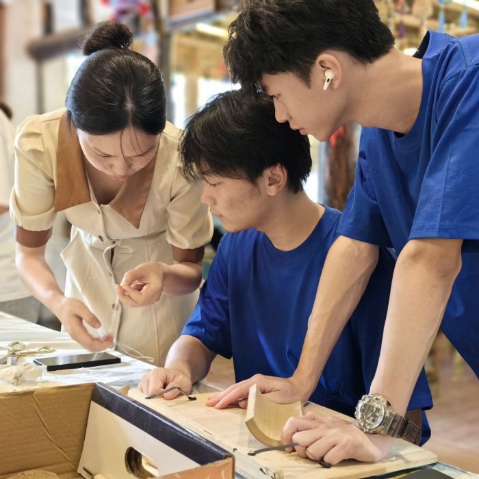 深耕非遗体验 转身文脉感知 基于这份精神共识,团队首先深耕"文化认知",在江安非遗文化节期间积极融入。成员们不仅在文化节现场参与互动体验,更受邀走进当地专门设立的非遗体验工坊进行深度探索,全方位触摸技艺温度:在缠花工艺里,细彩线在指尖缠绕出的不仅是花瓣,更是"慢工出细活"的匠人哲学;糖画制作中,糖浆流淌成的鸟兽形态,让民间艺术的灵动变得可感可知;江安竹刻体验时,刻刀与竹材的碰撞,让国家级非遗的文化厚重感从文字描述转化为掌心的震颤。这一系列沉浸式体验,成功让团队从"文化旁观者"转变为"文脉感知者",筑牢了后续传承行动的认知根基。