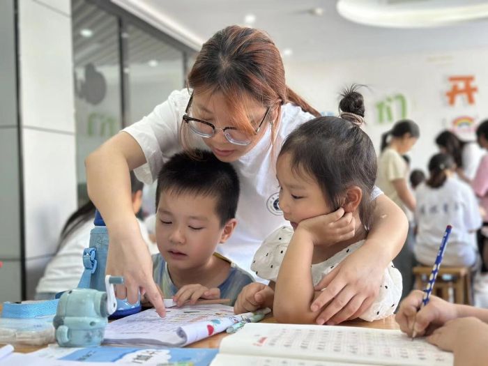 图为团队成员认真辅导小朋友学业。吕怡潇 供图