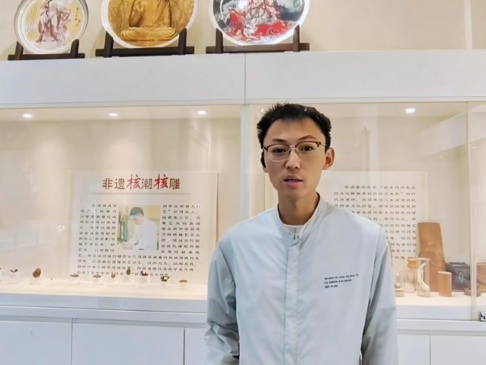 实践团队重点走访了平等街历史文化街区,与多位非遗传承人展开深入交流。在“非遗核潮核雕”工作室,核雕非遗传承人陈志远正在专心雕刻一件作品。“核雕创作需要经过选料、画样、雕刻、打磨等十多道工序,每一步都要精益求精。”他一边雕刻一边向队员们讲解。