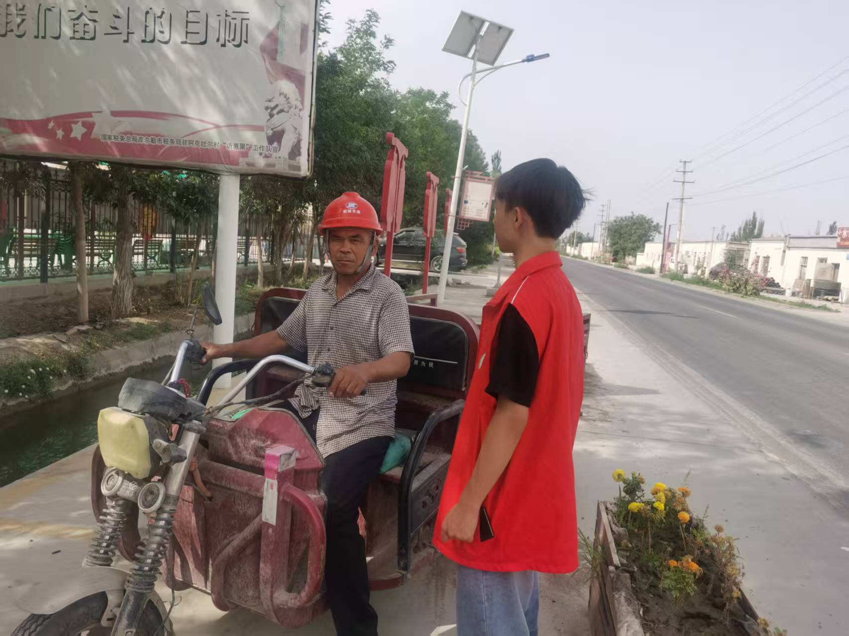 道路安全是乡村治理的重要环节。7月12日,实践团走上乡间道路,开展交通安全宣传教育。“您好,请佩戴好头盔。”队员们耐心地向电动车驾驶员讲解安全知识,并协助当地工作人员进行检查督促。一抹抹醒目的实践团服装色彩,成为了乡村道路上一道亮丽的风景线。