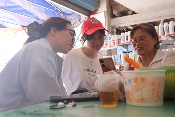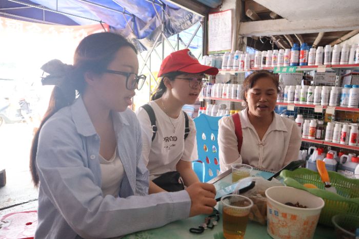 图为实践团成员与黎先娥老师交流了解蝴蝶歌的历史背景。梁志洲 摄