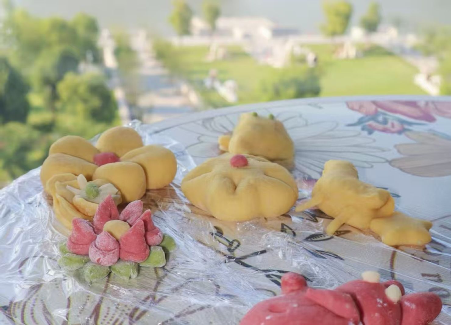 二、融合创新:以青春笔触绘就时代花馍在掌握基本技法后,团队致力于将现代审美与传统花馍相结合。队员们运用天然色素调制出清新雅致的“马卡龙色系”,将流行卡通形象与中国传统纹样融入造型设计中。有的队员为花朵添新叶,有的为动物加表情,在创意碰撞中,传统花馍焕发出俏皮的时代气息。这种既保留文化根基、又贴近年轻人语境的创新实践,有效激发了团队与周围青年群体对花馍技艺的兴趣。