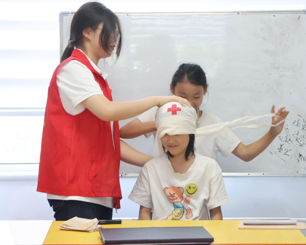 (图为实践团成员为小朋友们演示如何用三角巾包扎头部 亓菊摄)