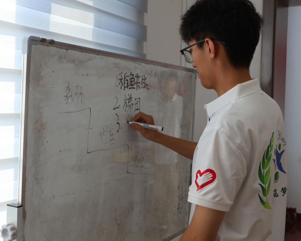 课程伊始,实践团的成员以生动的语言和形象的图片,向小朋友们介绍了“稻鱼共生”这一古老的农业非遗文化。通过讲解水稻与鱼类在生态系统中相互依存、互利共生的关系,不仅向孩子们传递了传统农业的智慧,也让他们深刻理解了人与自然和谐共生的重要性。小朋友们在成员的讲解下,纷纷举手分享自己对这一神奇农业模式的见解,课堂氛围热烈而活跃。