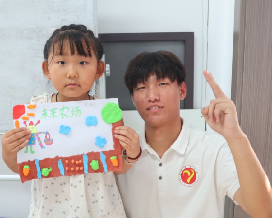 (图为实践团成员与小朋制作的未来农场的作品的展示合照 亓菊摄)