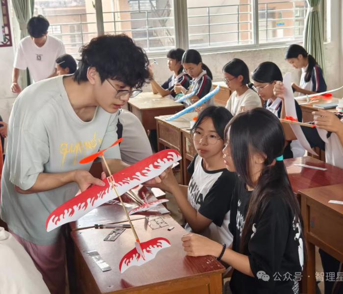 为响应国家政策、落实乡村振兴战略的重要实践 ,以物理教育为抓手,提升乡村学生科学素养,探索科技赋能乡村教育路径。广东二师“智理星河”教育实践团于2025年奔赴阳西县蒲牌初级中学开展了为期7天的 “三下乡” 社会实践活动。广东二师“智理星河”教育实践团由广东第二师范学院物理与信息工程学院2名优秀指导老师和16名相关专业大学生组成,专业涵盖物理学(师范)、科学教育(师范)及电子信息工程。本团队致力于在实践的星河中让孩子们体验航模,物理实验,音乐美术的魅力。同时进行国家资助政策的宣传。此次实践活动旨在通过我们的努力,以物理教育为抓手,提升乡村学生科学素养,探索科技赋能乡村教育路径。