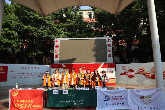 烈日下的集结:科普摊位引好奇八月的广州,周末午后的阳光依然炽烈。堇熙11.0服务队的队员们早早抵达沙园街道广重广场,在街道工作人员的支持下,迅速而有序地布置起活动场地:支起桌台、悬挂起醒目的“广东青年大学生百千万工程突击队”和“广东外语外贸大学堇熙11.0服务队”队旗、摆放好精心准备的宣传物料和活动奖品。他们忙碌的身影很快吸引了广场上休闲纳凉居民的目光。一位摇着蒲扇、身着背心的老伯用粤语好奇地询问:“靓仔靓女,你哋系度做咩啊?(你们在这里做什么呀?)”队员们擦去额头的汗水,笑着回应:“阿伯,马上就知道啦,是关于环保和金融的活动!”