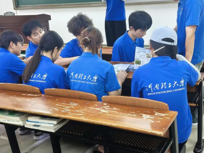 7月13日上午,在河南理工大学三号教学楼内,实践团成员围坐一圈,桌上整齐摆放着近几日从河南省焦作市韩平陵村、李屯村及孙村带回的调研资料。大家分组对这些资料进行逐一梳理,从海量数据中剖析乡村农业对科技服务的真实需求。经过三个多小时的系统梳理与热烈研讨,几组关键结论逐渐清晰:三个村中,超半数耕地通过合作社承包、大户流转等形式实现集约化经营,规模化农业形态正加速形成;尽管大部分农户表示知晓无人机喷药技术,但在未参与土地承包的个体农户中,超半数从未尝试过该服务,“知而不用”的矛盾尤为突出;在信息获取渠道方面,多数村民更倾向于通过抖音、快手等短视频平台获取信息,希望看到直观的技术演示,同时呼吁政府出台补贴政策,降低尝试新技术的经济门槛。