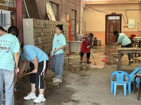 十一点三十分,最后一位老人放下碗筷。实践团成员迅速接过清洁重任,分成三组展开志愿服务:清洁组三人手持高压水枪冲刷地面油污,水流冲击声瞬间盖过电视声响;擦拭组五人拧干抹布,逐张清理餐桌;归整组两人合力搬运沉重座椅。水流冲刷地面的哗哗声、扫把清除污渍的沙沙声、拖把收尾的摩擦声瞬间在颐养之家回响。汗珠沿着年轻的脸庞滑落,浸湿了蓝色队服,但无人停下。一位成员弯腰用力擦拭桌腿时感叹到:“一遍下来腰就酸了,两位奶奶五年如一日的坚持真是了不起。”