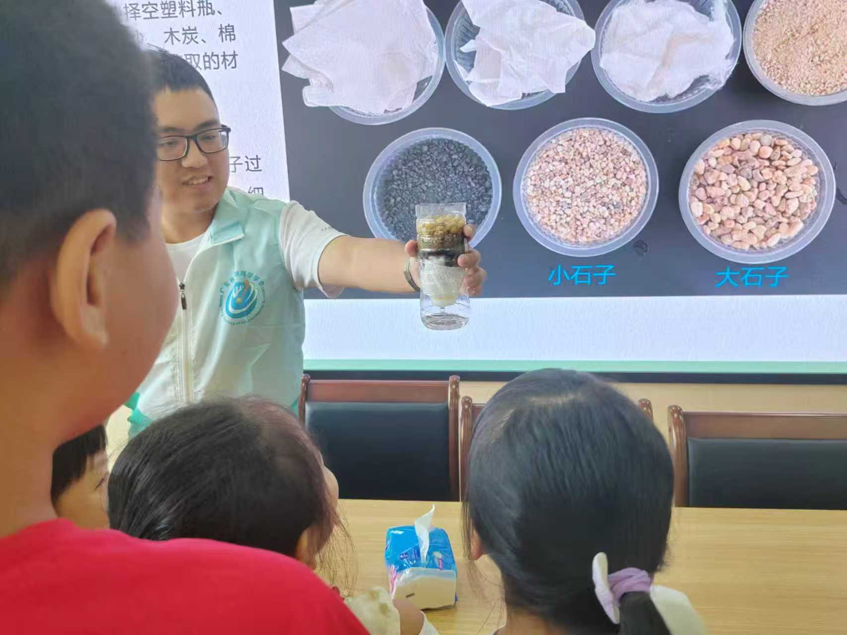 服务队走进凤凰社区,开展“节水、爱水、护水”主题科普活动。队员们通过PPT讲解、情景模拟和互动问答,向社区小朋友普及水资源保护知识。其中,最具特色的是现场演示的自制滤水装置,通过石子、细沙、木炭等材料层层过滤,浑浊的水经过层层过滤变得清澈,小朋友们亲手操作后兴奋地喊道:“水真的变干净了!”,节水护水的种子悄然播撒进他们的心田。