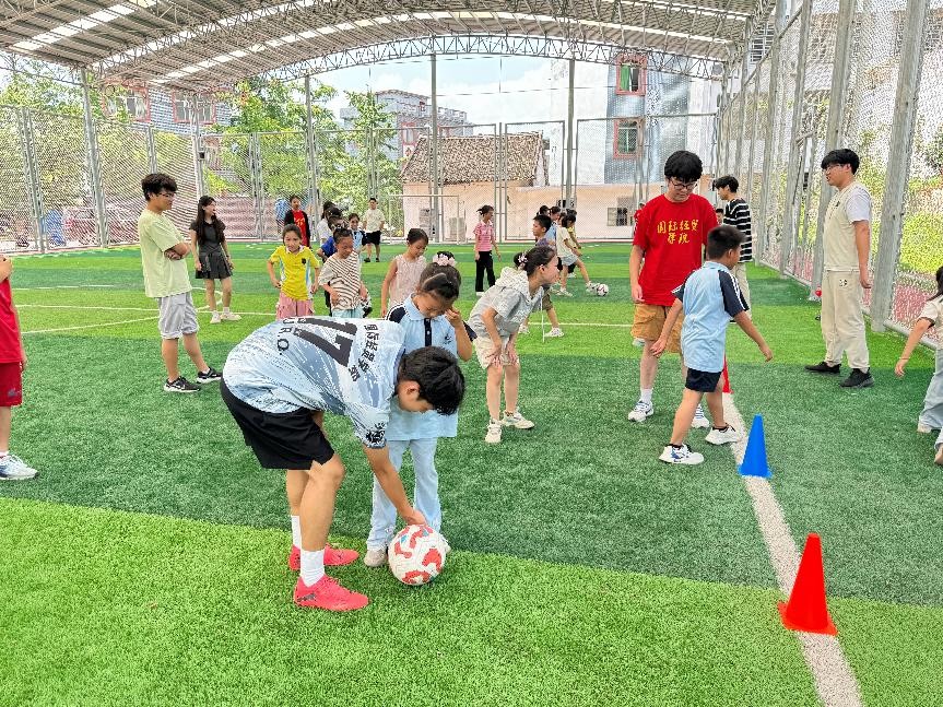 图为实践队员为孩子讲解踢球动作。刘子暄 摄