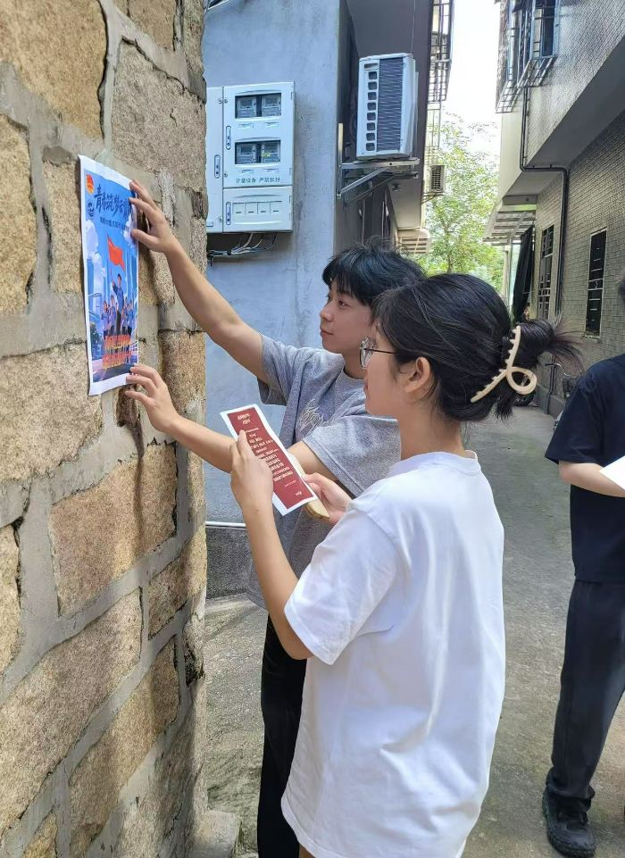 村落传声,点亮基层烟火 实践的第一站,我们走进云霄当地村落。带着精心筹备的宣传物料,队员们通过张贴海报、面对面讲解的方式传递给村民。公告栏上的一张张海报、交谈中一句句耐心的解答,不仅让信息触达基层,更拉进了与村民的距离,用青年行动为乡村注入温暖活力,也为后续的红色探索积蓄了民生温度。