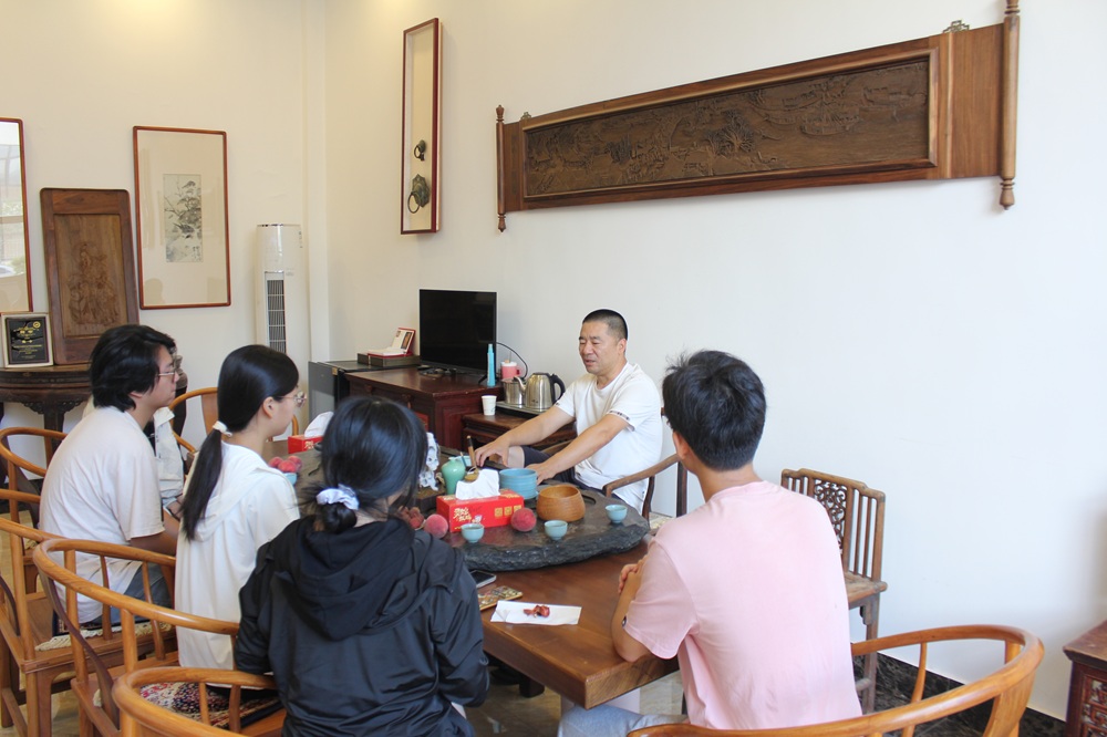 走访东阳市木雕城调研传统工艺市场现状在红木家具城,小队成员们走访了木雕城内的几家商铺。在一家经营仿古木雕家具的店铺内,学生们向店主询问产品原料产地、制作周期及销售渠道等信息,店长对于红木家具现如今的行情略感失落,但仍对未来的发展和机遇充满期待。
