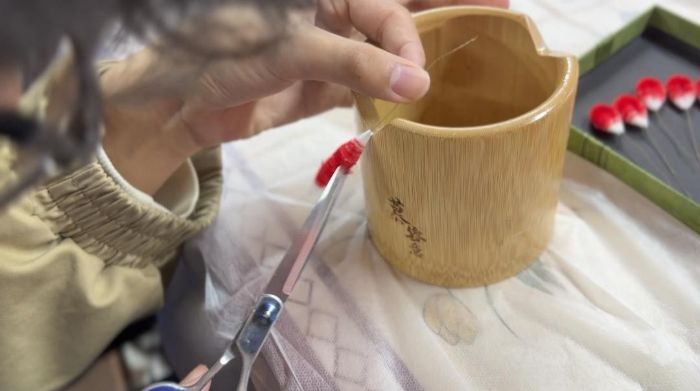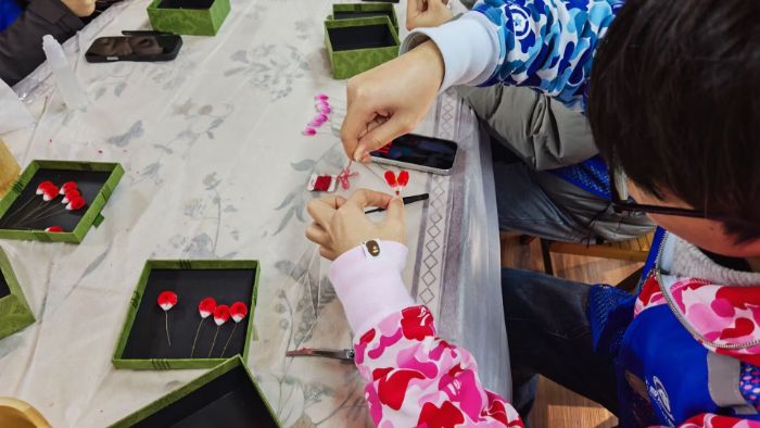 随后,成员们便手持胶水、剪刀、蚕丝等工具,正式投入到绒花的手工制作中。大家专心致志,沉浸其中,专注于裁剪出花瓣的雏形,力求每一片轮廓都流畅自然,并小心翼翼地用线将花瓣与花杆结合,把控着每一处细节的精准度。最终,每个人都成功雕琢出独属于自己的纯手工绒花。曾几何时,随着鲜花普及与审美变迁,南京绒花一度淡出市场。但幸有传承人坚守创新:周家凤大师在“一事三节”传统造型外,拓展出花鸟鱼虫、人物走兽等三百余种新样式,让绒花从头饰延伸至摆件、挂饰;赵树宪传承人通过公益展演拉近非遗与大众的距离,更带领后辈将现代元素融入创作——动漫IP造型、绒花首饰、立体装置艺术,让古老技艺焕发新活力。