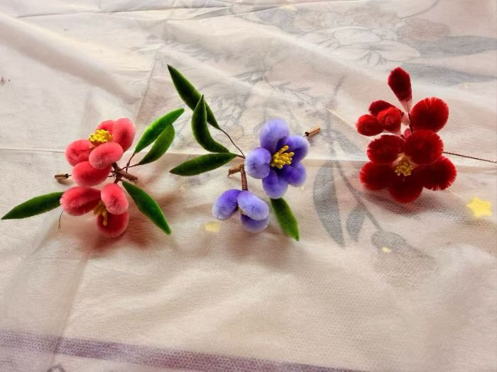 在传承人工作室,能亲眼见证"一根蚕丝变繁花"的奇迹:煮丝染色后,匠人手持细铜丝夹住绒丝反复搓捻成条,再经打尖塑形、传花组合,原本朴素的蚕丝便化作牡丹吐蕊、喜鹊登枝。那些看似轻盈的花朵,藏着劈绒、勾条的精妙火候,每一片花瓣的晕染色彩,都源自天然草木的馈赠,这是机器永远无法复刻的手工温度。纤细的蚕丝在匠人手中几经捻、搓、绕、粘,便化作一朵朵栩栩如生的花钿——艳而不俗的牡丹层层叠叠,灵动娇俏的梅花缀满枝丫,还有那缀着珠翠的吉祥纹样,每一针每一线都凝结着老南京手艺人的匠心。