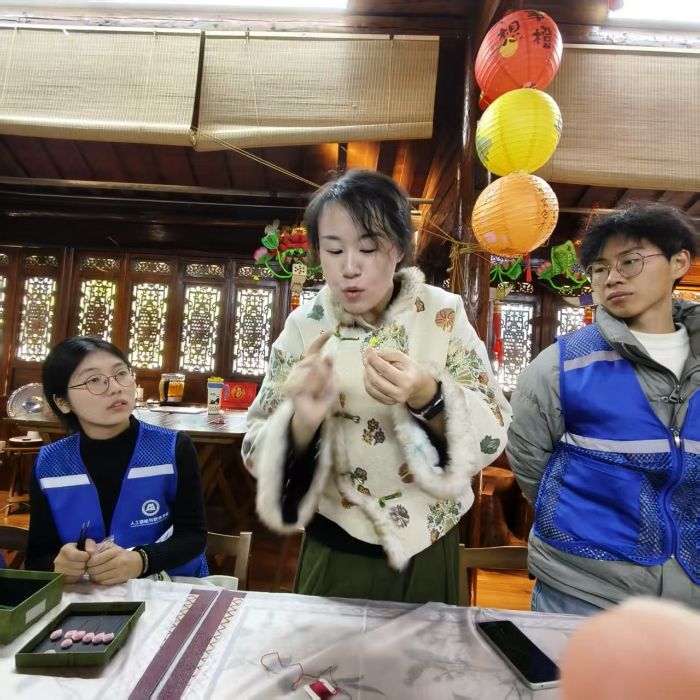 本次活动由资深绒花艺人余晔老师全程指导。活动伊始,余老师结合绒花的发展脉络,为团队成员细致讲解了这项非遗技艺的历史渊源,更拆解了蚕丝筛选、染色、搓条等原材料的制作工艺,让大家对绒花“一朵绒花,半缕匠心”的精髓有了深刻认知。同时,通过传承人讲解得知,绒花技艺已从传统鬓头花拓展至家居摆件、艺术装置等现代品类,还通过“非遗进校园”“线上零售”等方式扩大传播,这种“守正创新”的传承模式,让实践团成员明白非遗文化唯有融入现代生活,才能永葆生命力。