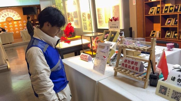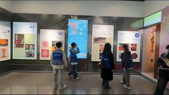 刚踏入南京市博物馆展馆大门,一股厚重的历史气息便扑面而来。作为我国第一座国家投资兴建的大型综合类博物馆,南京市博物院“金镶玉成,宝藏其中”的建筑理念令人印象深刻,“一院六馆”的格局系统呈现了中华文明的多元维度。实践团成员首先径直走向江苏省非物质文化遗产展区,当绒花展品映入眼帘的那一刻,所有成员都忍不住发出惊叹。展台之上,一朵朵绒花色泽鲜亮、栩栩如生,牡丹雍容华贵,梅花清雅傲骨,每一片花瓣都由匠人以蚕丝细细搓绒、巧手缠制而成,纹理细腻得仿佛微风一吹便会轻轻颤动。成员围在展柜前,一边聆听讲解员讲述绒花制作的繁复工序与传承故事,一边忍不住拿出手机记录这惊艳的传统之美。在非遗馆,现场演示的金陵剪纸、秦淮灯彩等技艺,展现了传统文化在当代的活态延续。