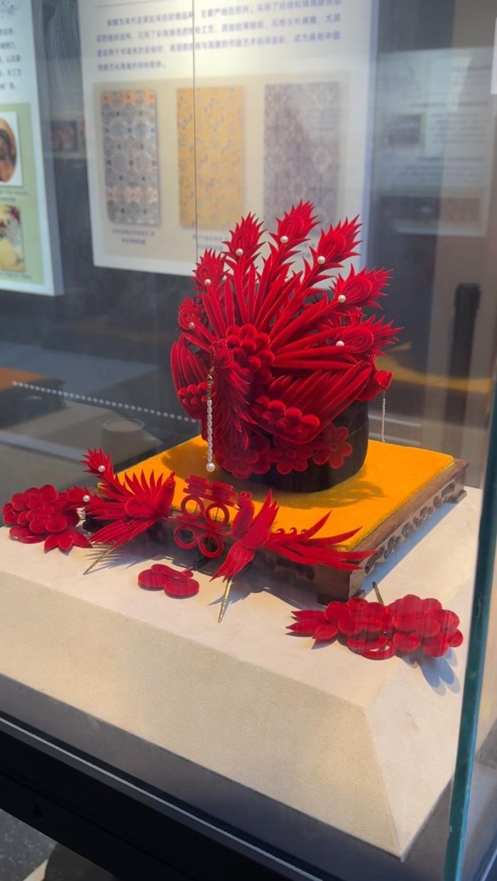 更令人惊喜的是绒花的“破圈”之路:从《延禧攻略》的古典发饰到《狐妖小红娘》的九尾狐造型,从爱马仕的橱窗艺术到迪奥秀场的帽章点缀,这项古老手艺在年轻传承人手中焕发新生。馆内互动体验区中,游客可亲手搓捻绒条,在专业老师指导下制作简易绒花梅花,亲手定格非遗温度,将这份传统雅致带回家。绒花不只是饰品,更是活着的历史。它在宫廷与民间流转,在传统与现代之间平衡,让每一个走进这里的人,都能读懂南京的细腻与坚守。穿堂过院,看雕花木窗映着天光,听空竹嗡嗡作响,一砖一瓦、一针一线,都盛满了江南民俗的温润与厚重。