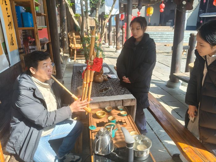 随后,团队前往广西程阳八寨景区,采访了三江侗族芦笙非遗传承人陈群伟。陈群伟传承人为人和蔼友善、知识渊博,结合自身多年的传承经历,从芦笙的起源传说、不同种类,细致讲解到芦笙所承载的民族情感与文化意蕴。他介绍,芦笙的发展始终与时俱进,从最初的三孔五音,逐步改良到十八管,演奏范围也从传统民俗乐曲拓展到现代流行音乐,在坚守传统的同时不断顺应现代化发展。采访过程中,一位制作侗族乐器的村民恰巧路过,陈群伟传承人立刻热情邀请他,二人默契配合,现场合奏了一曲经典芦笙曲,悠扬的笙声回荡在村寨中,让团队成员亲身感受了芦笙的独特音色。谈及传承,陈群伟强调,要让芦笙真正走进校园。