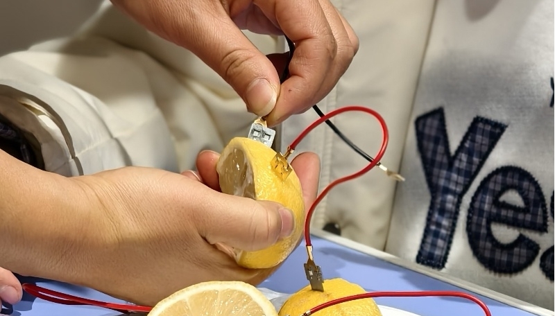 科普讲堂结束后,队员们还在村委楼前广场设置了“流动绿能实验室”。最受欢迎的当属“水果电池点亮LED灯”互动实验。在队员罗海霞的指导下,几个孩子将锌片和铜片插入柠檬,连接导线后,小灯泡瞬间发出微弱的黄光。“这就是电!大哥哥大姐姐在大学里,就是研究怎么用更清洁的电,来保护环境、制造有用的东西。”小张一边引导孩子观察,一边将话题引向团队的研究课题。此外,队员们还展示了简易电解水装置,让孩子们亲眼见证水变成气泡(氢气和氧气)的过程,并用pH试纸测试了不同水样的酸碱性,将环保理念融入趣味实验中。现场气氛活跃,科学的魅力在亲手操作中得以传递。