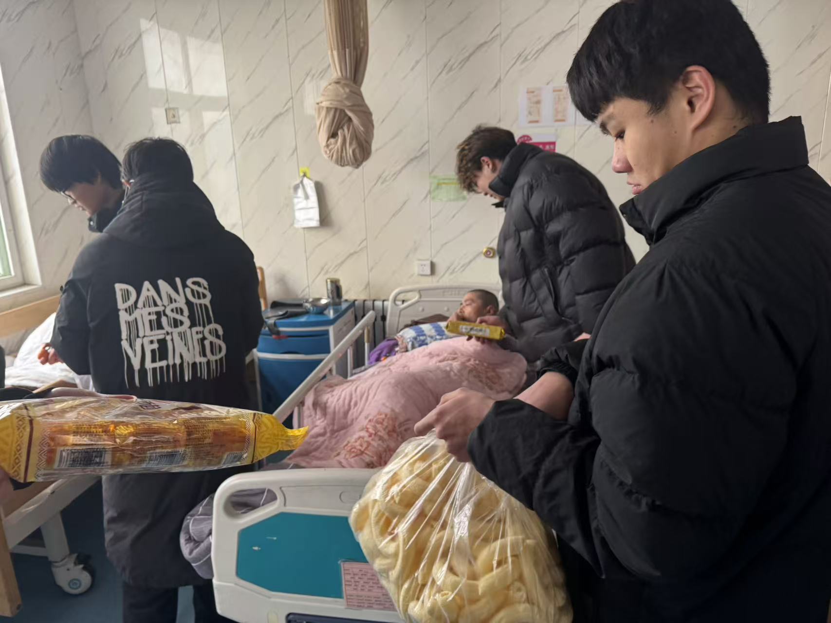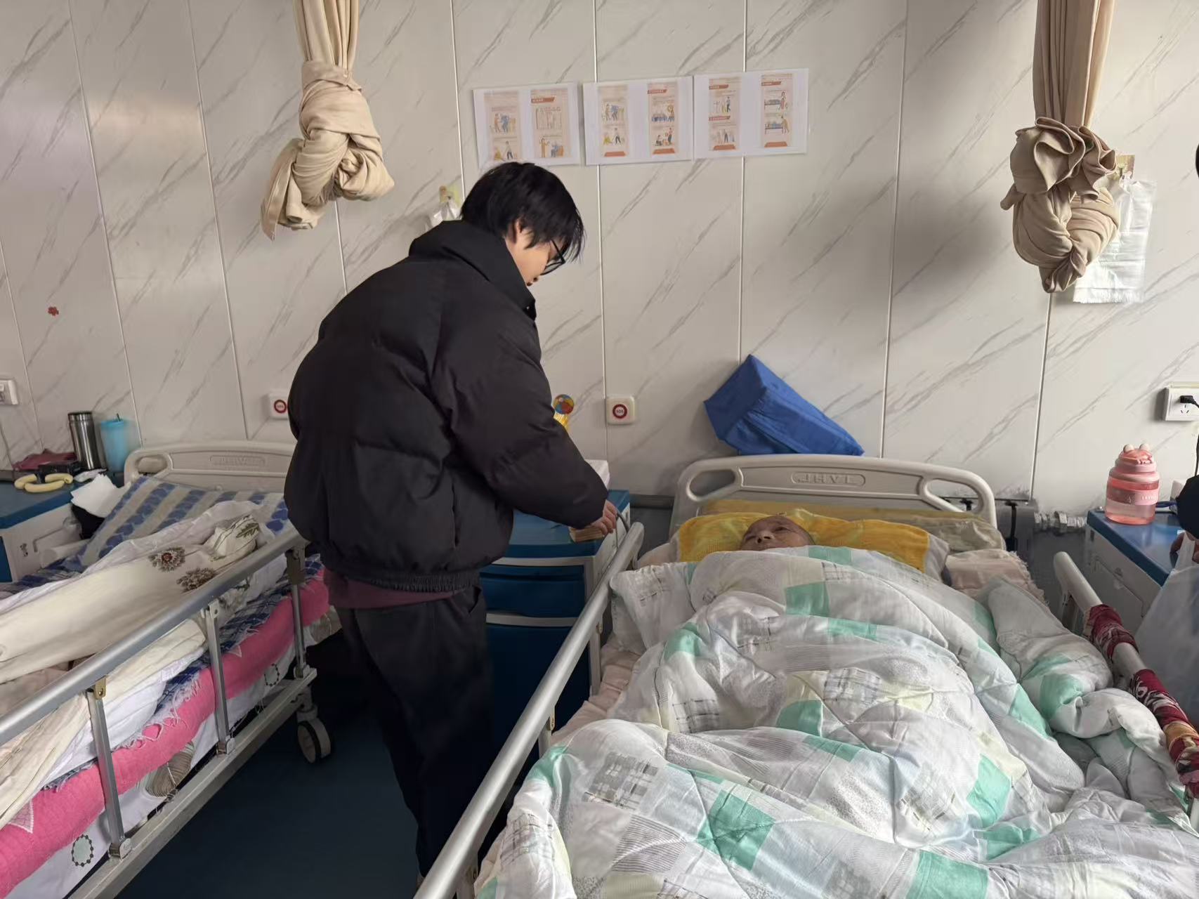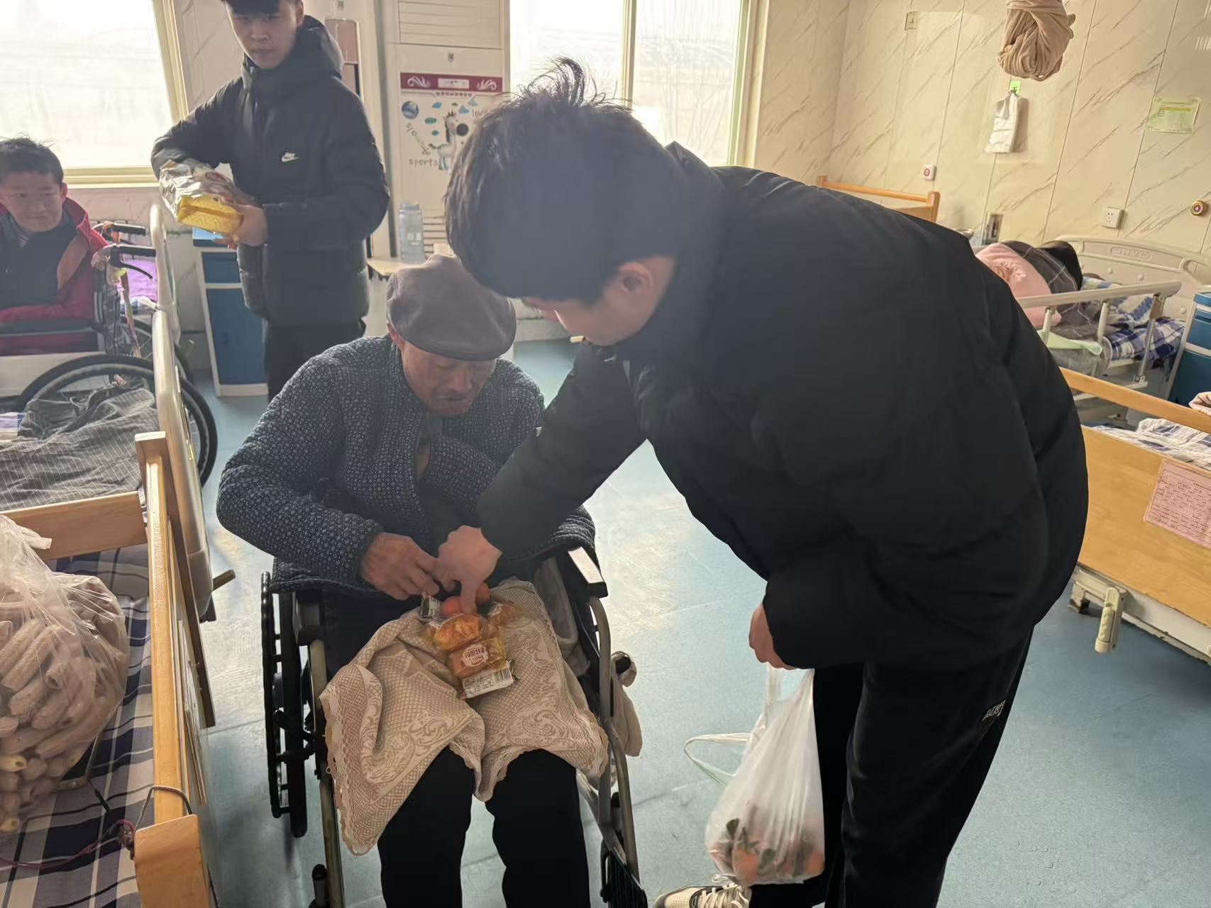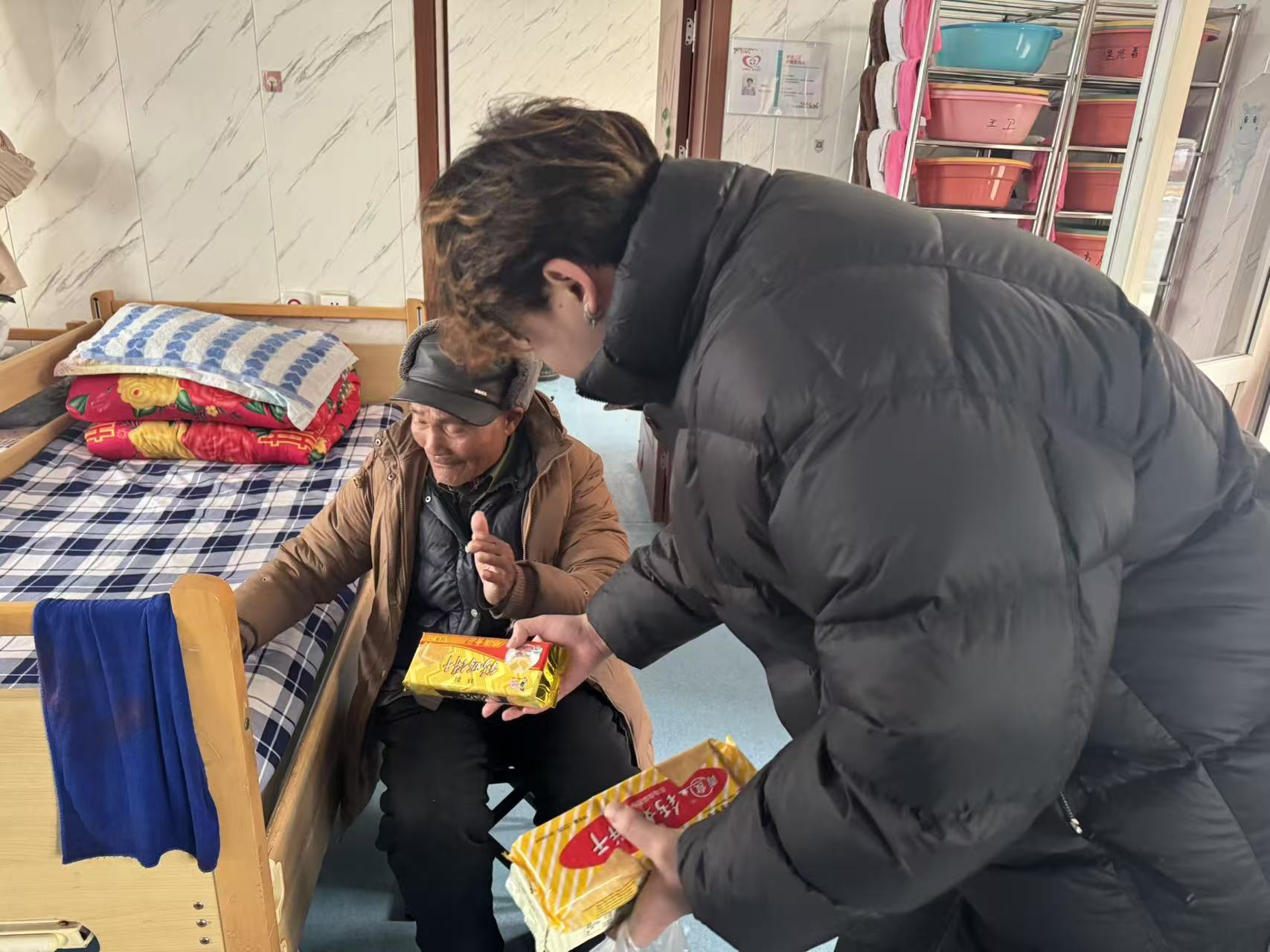 活动现场,志愿者们带着精心准备的面包、饼干、水果等慰问品,逐一走进老人的房间,将一份份饱含心意的礼物送到老人手中。面对行动不便的老人,志愿者们俯身弯腰,耐心地将食物递到他们手中,轻声叮嘱老人注意身体;有的志愿者陪老人唠家常,倾听他们的过往故事,用真诚的笑容驱散老人的孤独;还有的志愿者主动帮忙整理床铺、打扫房间,用细致的服务让敬老中心更显温馨。