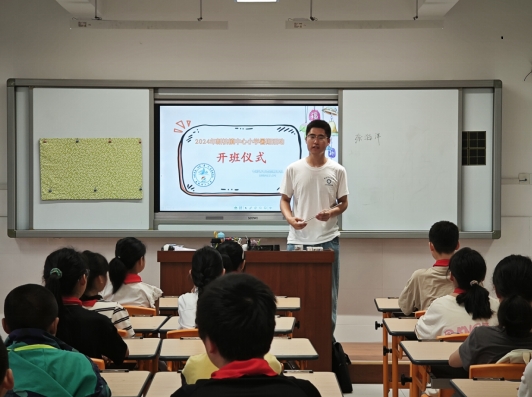 随着授牌仪式的成功举行,安徽理工大学土木建筑学院七彩青春,阳光“童”行志愿服务队的“三下乡”社会实践活动正式启动。为增强团队成员之间的凝聚力和向心力,使后续活动的开展更加顺利,安徽理工大学土木建筑学院七彩青春,阳光“童”行志愿服务队于 2024 年 7 月 14 日在新杭镇中心小学正式举行开班仪式,为这里的孩子带来了期盼已久的第一堂课。此次支教活动旨在激发孩子们的热情和积极性,使大家以更加饱满的热情和坚定的信念投入到课程学习中去。