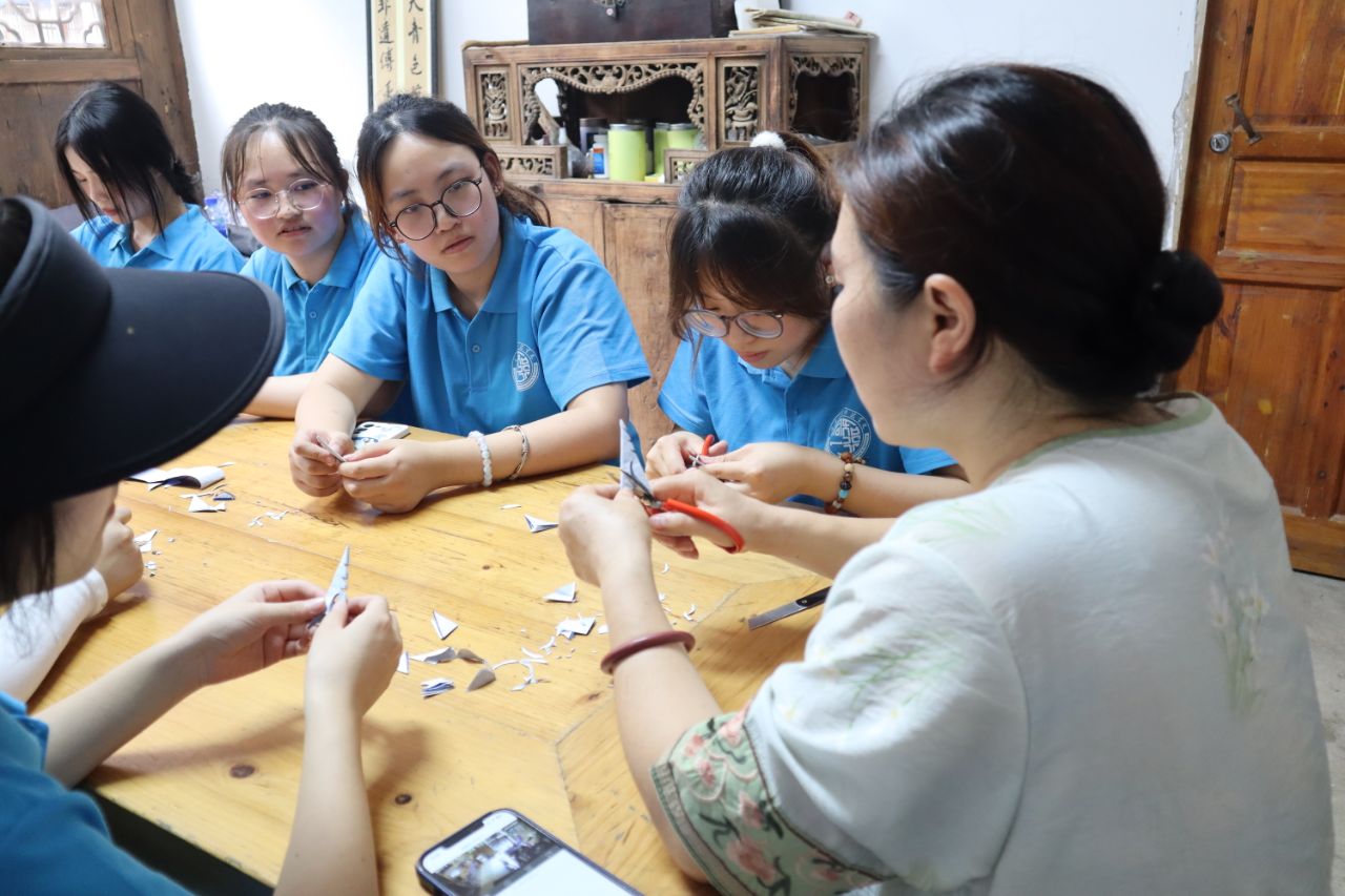 首先非遗剪纸艺术传承老师向实践团成员介绍剪纸的基本概念、历史和文化背景,展示一些优秀的剪纸作品,同时,老师现场演示剪纸的制作过程,包括选纸、折叠、裁剪、刻画等技巧,让实践团成员们初步了解剪纸的基本步骤和方法。(图为实践团成员与老师学习剪纸)白慧敏摄实践团成员在老师的指导下,尝试自己动手制作剪纸作品。老师根据学生的实际情况,给予适当的指导和建议。同时,实践团成员之间相互交流自己的剪纸作品,分享经验和心得,老师也对学生的作品进行点评和指导。