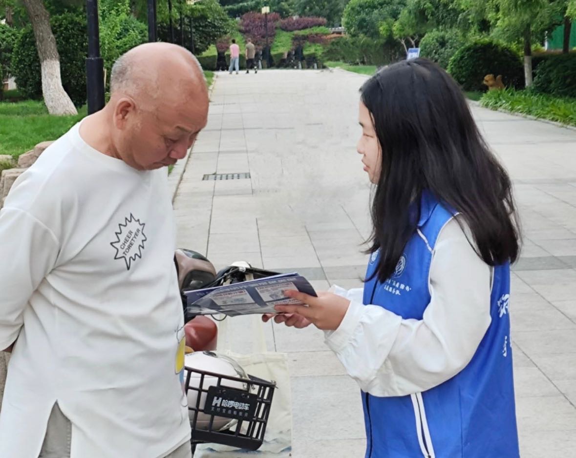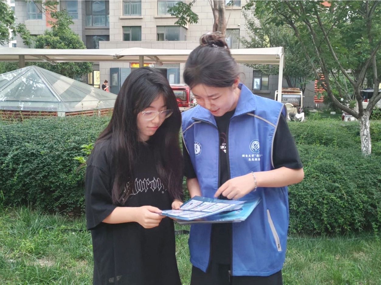 7月16日,实践队前往在滨州市博兴县纯绣小区和济南市市中区杆石桥社区发放宣传单页,对社区居民以面对面讲解等方式进行普法宣传,让广大群众对该犯罪行为有更加全面的了解,保障群众财产安全和切身利益,提醒居民擦亮眼睛,时刻绷紧防范之弦,切莫为了贪图一时之利误入歧途。现场居民纷纷表示受益匪浅,会将相关知识铭记于心,在遇到类似情况时会保持清醒的头脑,避免沦为犯罪分子的“工具人”。(图为实践队成员向当地居民讲解帮信罪普法宣传 “法盾防诈”实践队 李凯琪 供图)