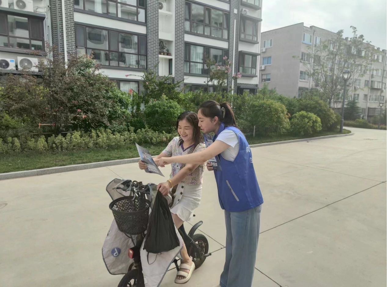 7月13日,实践队前往烟台市牟平区安德利沁水河花园开展社区宣传活动,选取人流量较大的社区门口,精准定位人群,针对性发放宣传单页,扩大帮信罪的普及范围。在宣传过程中,不少居民提出诸多疑问,渴望了解更多帮信罪知识,以保护自己和家人的财产安全。团队成员向居民提供了许多帮信罪预防建议,如不要向陌生银行账户转款,不要下载来源不明的手机APP以及不要点击登录未知的网址链接等,这些措施一定程度上可以有效地预防帮信罪的发生。(图为实践队成员向居民讲解帮信罪知识 “法盾防诈”实践队 张乐窈 供图)