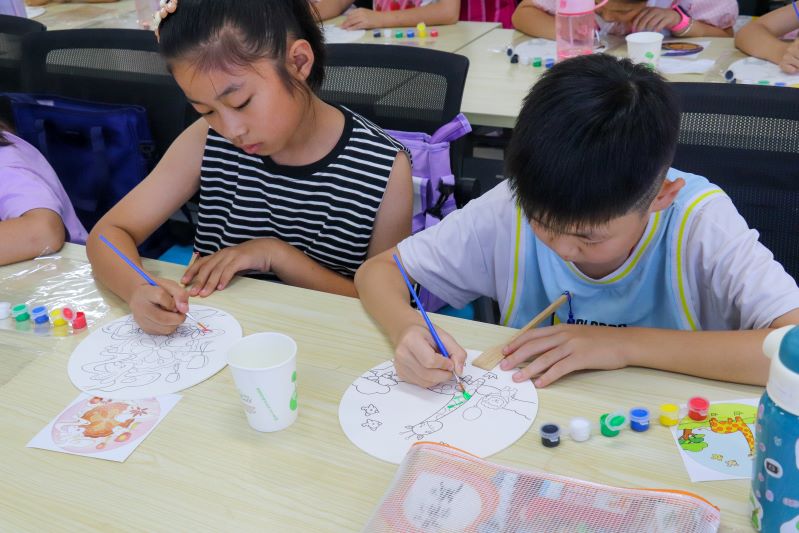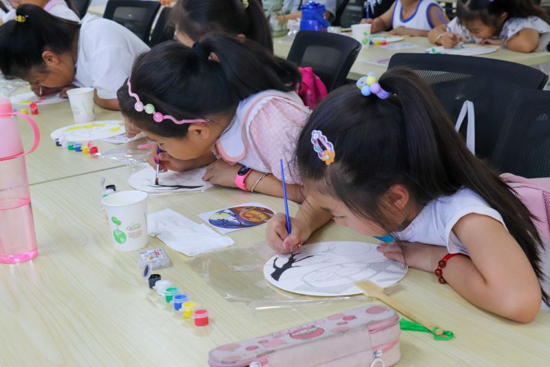 在实践团成员的悉心指导下,孩子们开始了自己的创作。有的孩子在扇面上勾勒出荷花的轮廓,寓意着高洁与坚韧;有的则大胆挥墨,将抽象的图案与缤纷的色彩交织在一起,展现出无限的创意。整个过程中,孩子们与实践团成员之间的互动热烈而积极,空气中弥漫着艺术的气息和快乐的笑声。