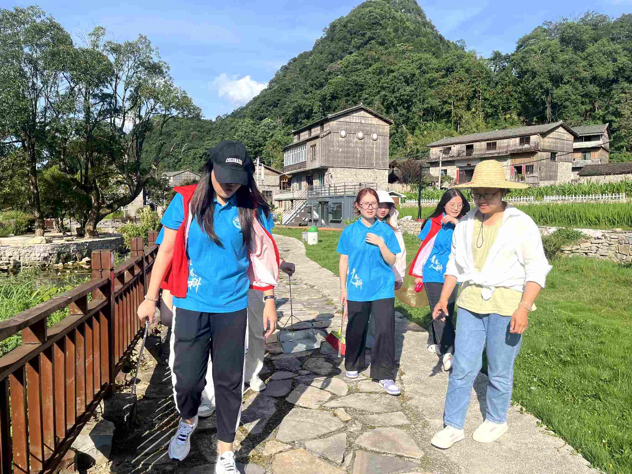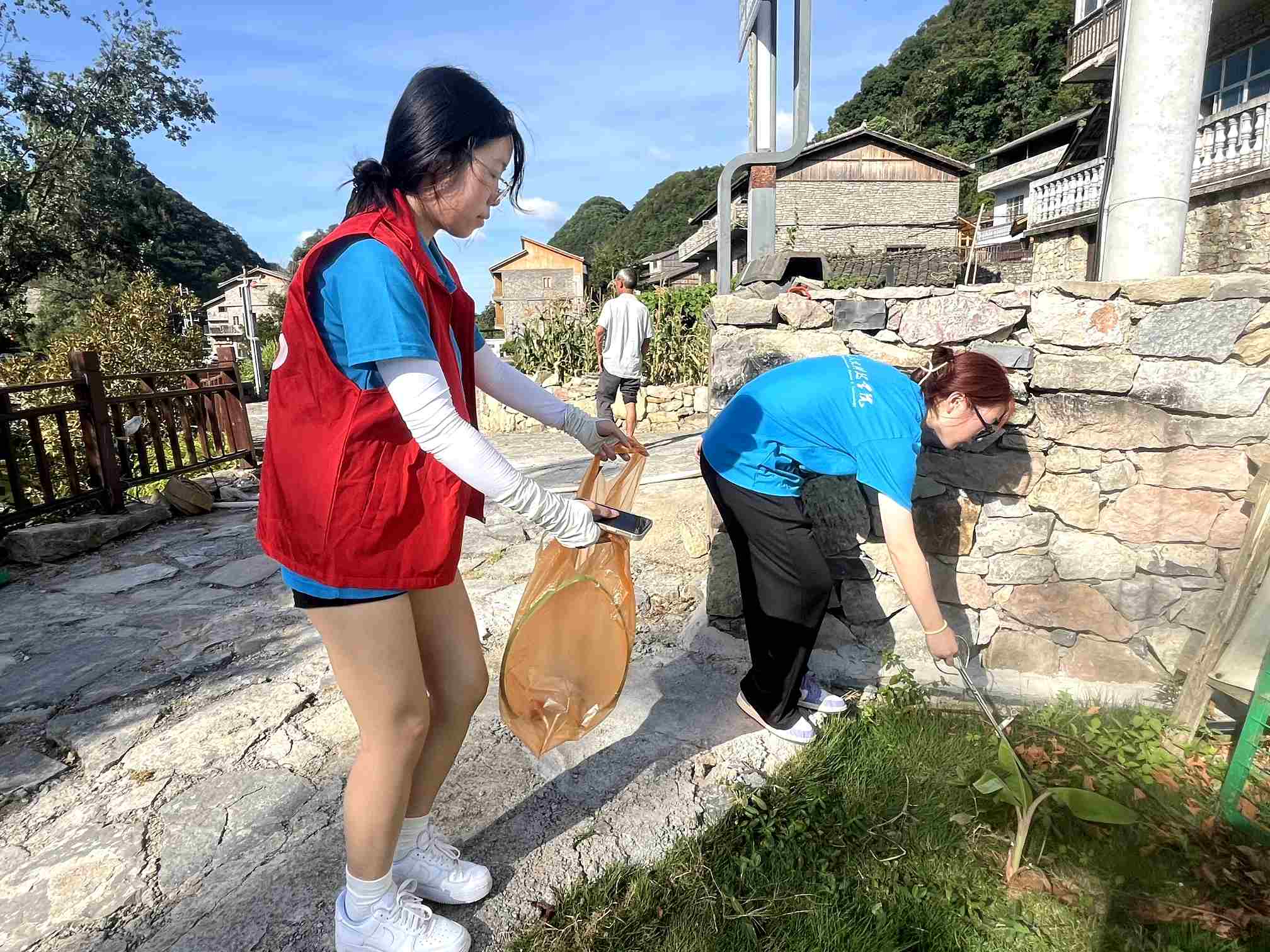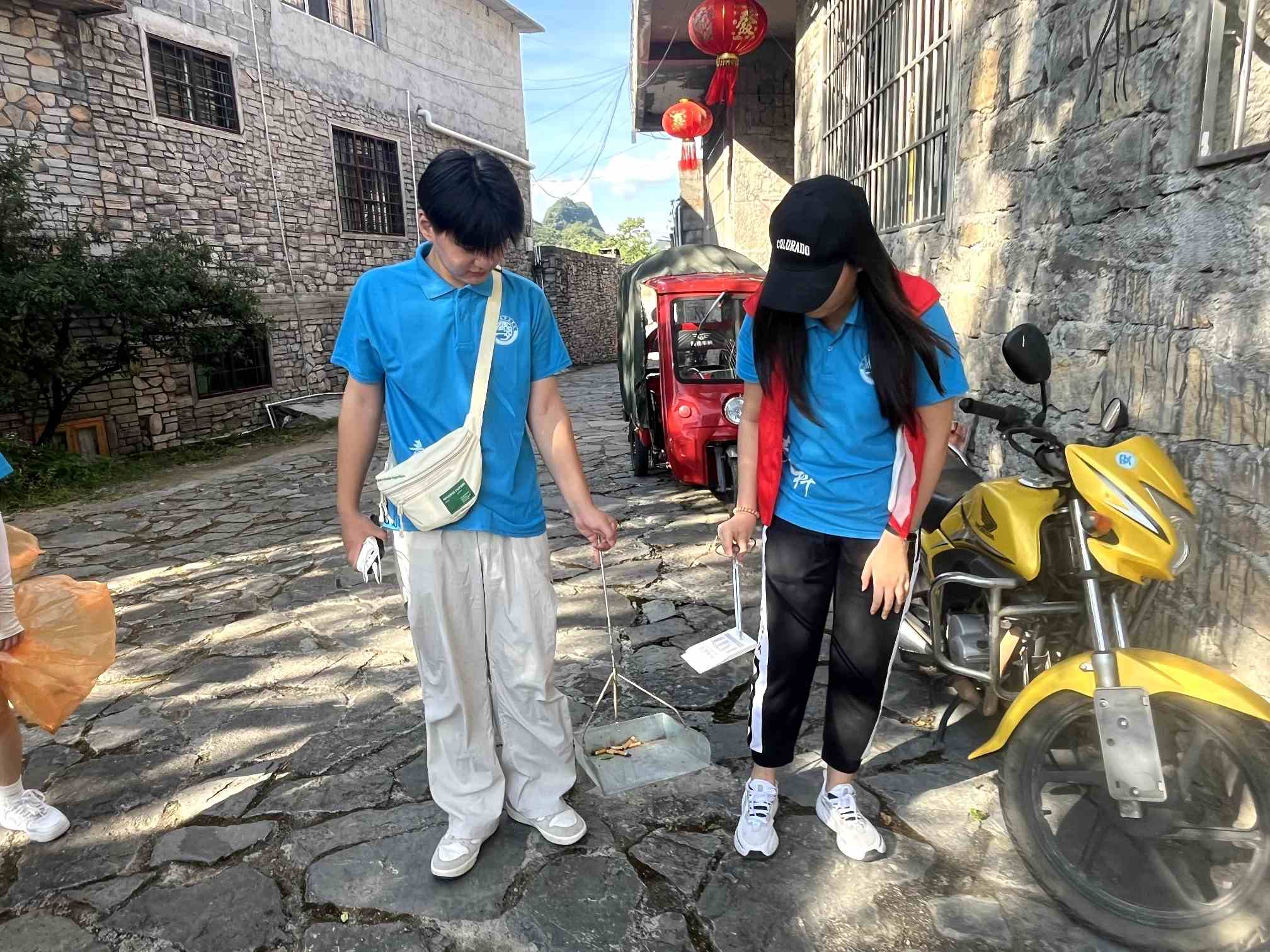 接着在寨子里,村干部带领我们体验了她们维护坡鼐古寨生态环境的日常工作,实践团成员身穿贵州志愿者特色标志的小青椒红马甲,手拿夹钳、扫帚、垃圾袋,在寨子里穿梭,开展了捡拾垃圾,清扫卫生的志愿服务活动。