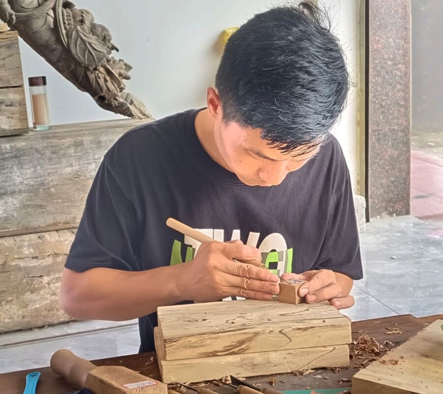 在刚开始收到实践队成员需凭一己之力雕刻印章这一消息的瞬间,我无比震惊且呆若木鸡。对于刚接触并学习通山木雕不到五天时间的新手来说这无异于赶鸭子上架,但随后我的心中无比亢奋,隐隐期待自己能够成功雕刻出精美作品,展现自己能够为非遗文化的传承做出努力的决心。在观摩成希老师的示范后,我便迫不及待以刀代笔,以木为纸,雕刻印章。