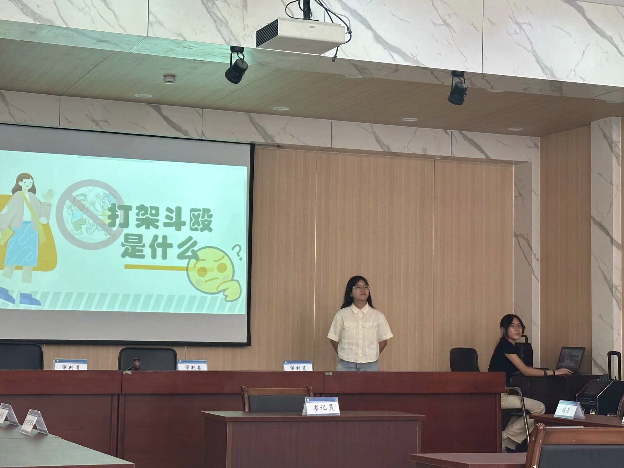 第三场模拟法庭的主题为“打架斗殴”。本案以希望小学严律己和王可怜两位同学在教室课间休息时嬉闹,结束后即将上课前,王可怜不慎被严律己从背后用手推后摔倒,导致王可怜的两颗门牙磕到桌角后呈斜角式断开。事发后原告王可怜提出诉讼,要求严律己一家和希望小学共同承担赔偿责任。在本次模拟法庭中,孩子们积极参与,认真完成了本场法庭辩论。