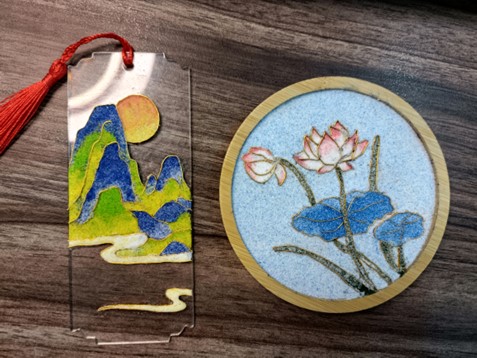 执丝为笔,以釉为彩。景泰蓝掐丝珐琅是中国著名的非遗技艺,起源于元朝,盛行于明朝,在乾隆时期达到发展顶峰。为使大家更好地了解这项技艺,徐若涵从掐丝珐琅的历史起源、发展过程、和制作工艺等方面带同学们走进掐丝珐琅。同学们聚精会神地听着,对这一传统工艺表现出了浓厚的兴趣。在介绍完掐丝珐琅的相关知识后,在实践团成员的指导下,同学们亲自动手体验掐丝珐琅的制作过程,通过掐、拉、绕、折等掐丝技巧把金丝黏在轮廓上;多次平均着色……经过两个小时的精雕细琢,一幅幅色彩鲜艳、精巧细致的图案逐渐成型。“这个书签看着简单,做起来才感觉很不容易。”在完成作品的制作后大家纷纷感叹制作一件精湛工艺品的不易。