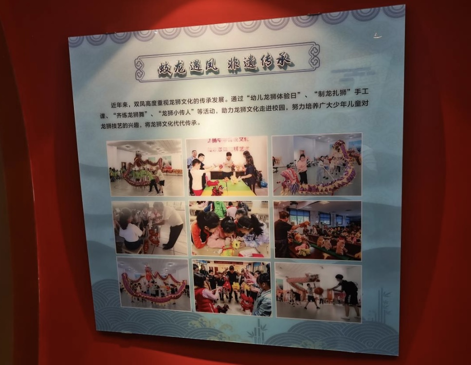 接着,王老师又领着同学们参观了一面又一面的宣传墙,细致耐心地为其讲解:多年来,为确保舞龙狮文化的传承,双凤镇政府高度重视文化的传播、积极采取多项措施加以保护和推广。在全面记录舞龙狮表演、制作工艺等珍贵资料的同时,政府还提供了资金支持,举办各类舞龙狮培训班和讲座;鼓励、邀请经验丰富的舞龙狮艺人开展传承活动,吸引年轻人踊跃参与,以此来传授技艺、培养更多舞龙狮文化的后继人才。此外,双凤镇还注重舞龙狮文化的创新发展。在保留其传统精髓的基础上,结合现代元素,创编出新颖独特的舞狮节目,使其更具观赏性和时代感,还尝试开发与舞狮相关的文化产品,进一步扩大舞狮文化的影响力。