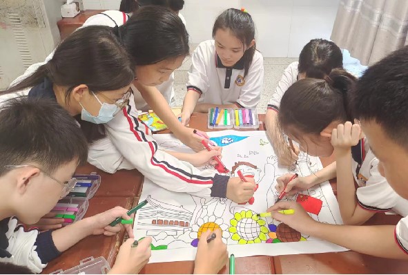 实践团成员们以汕头市东征军革命史迹陈列馆中“红军药箱”的故事为主线,让中学生们对药学工作者在抗战中的英勇事迹有更深入了解。以《周恩来童年的读书故事》为剧本,带领学生们一起开展沉浸式的红色画卷绘画课堂,在绘画中进行爱国主义教育,感悟革命先烈用生命换来的和平生活来之不易。